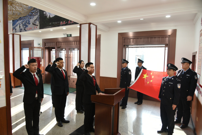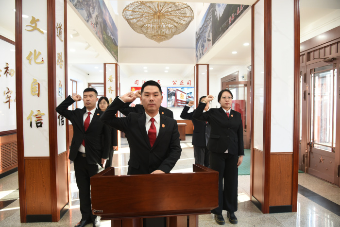 宣誓仪式在雄壮的国歌声中拉开帷幕。全体宣誓人员身着法服列队肃立,神情庄重,齐唱《中华人民共和国国歌》。随后,由政治部副主任戚技领誓,大家高举右拳,庄严宣誓:“我宣誓:忠于中华人民共和国宪法,维护宪法权威,履行法定职责……”誓言字字铿锵,充分展现了新时代法院干警忠诚履职、为民司法的坚定信念。