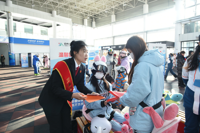 “旅游团宣传的内容和实际旅游不一样,怎么维权?”“游玩过程中发生纠纷,去哪找法官?”普法活动现场,法官在咨询台耐心解答游客问题。同时,干警们来到游客和景区工作人员身边,向大家普及法律法规,传播宪法精神。现场法治氛围浓厚,游客和干警互动热烈,雪具大厅变身“法治大厅”。